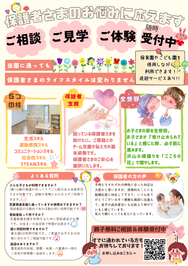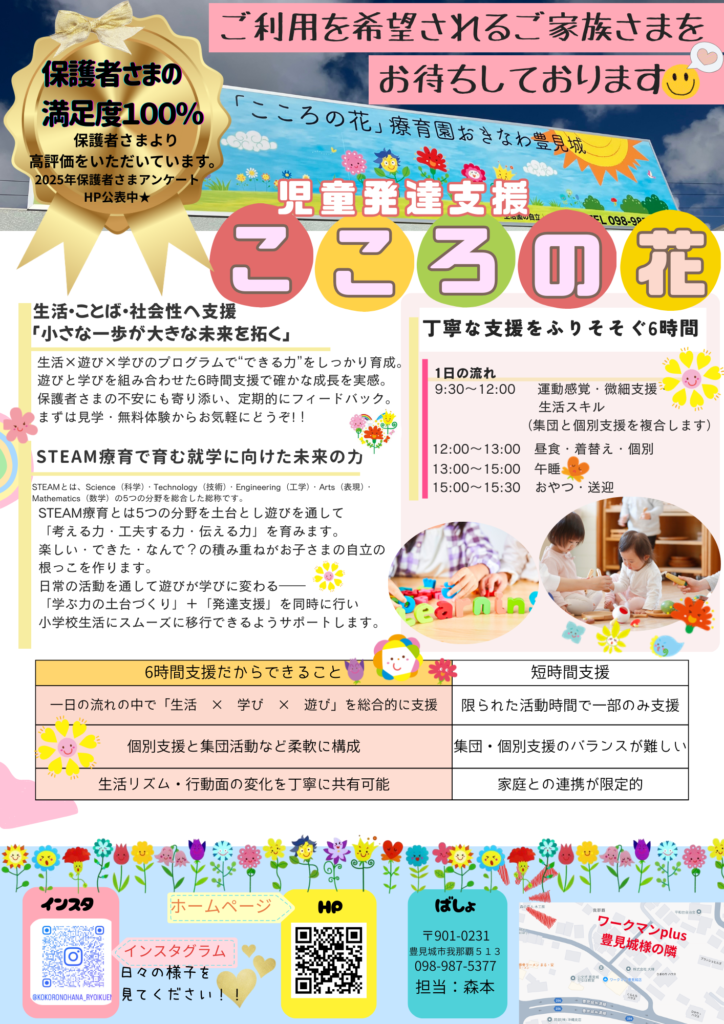 この想いを根底に、現在ではグループとして認定こども園・保育園を合計11施設と児童発達支援施設を運営しています。子どもたちはもちろんのこと、保護者の皆様、地域の皆様など当園に関わっている全ての方々に幸せになってほしいと願い、児童発達支援施設「こころの花」療育園おきなわ豊見城を開設いたします。